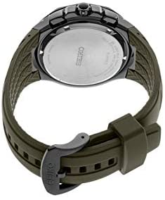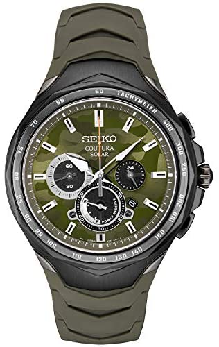 Brand Name Seiko Model number SSC747 Part Number SSC747 Item Shape Round Dial window material type Sapphire Crystal Case material Stainless Steel Case diameter 45.5 millimetres Case Thickness 12.28 millimetres Band Material Silicone Band length Mens Standard Band width 20 millimetres Band Color Green Dial color Green (With Camoflauge Pattern) Bezel material Stainless Steel Bezel function Stationary Calendar Date Special features Camouflage patterned Dial, Solar, Powered by Light Energy, 6 Month Power Reserve Once Fully Charged, Power Reserve Indicator, Chronograph Measures up to 60 Minutes of Elapsed Time in 1/5 Second Increments, 24 Hour Indicator, Date Calendar, Lumibrite Hands & Markers Movement Japanese Quartz Display Type Analog