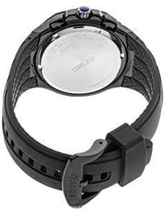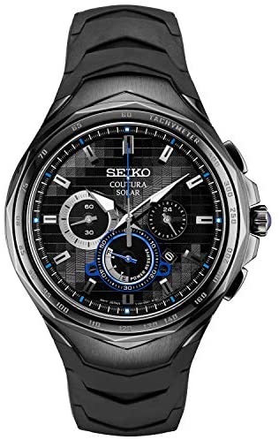 From the Coutura Collection. Delivering the perfect blend of sport and style for those on the move, this boldly distinctive solar chronograph provides effortless timekeeping excellence. The black dial with pixelated pattern and vivid blue accents features chronograph and 24-hour subdials, a power reserve indicator, date calendar, and LumiBrite hands and markers. Crafted of stainless steel, with black ion-finish and specially designed black silicone strap, this versatile watch includes a screwdown caseback, sapphire crystal and cabochon crown. The chronograph function offers timing to 60 minutes in 1/5-second increments with split time measurement. Powered by any light source, with no battery change required, the Solar Cell is energy-efficient, with a 6-month power reserve when fully charged. 10 bar, 100M Water Resistant.