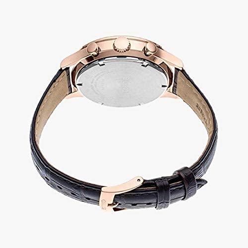 Rose gold-tone stainless steel case with a brown leather strap. Fixed rose gold-tone stainless steel bezel. Silver-tone dial with rose gold-tone hands and Arabic numeral & index hour markers. Minute markers around the outer rim. Dial Type: Analog. Between the 4 and 5 o'clock position. Chronograph - sub-dials displaying: three - 60 minutes, 60 seconds, 24 hours. Quartz movement. Scratch resistant mineral crystal. Pull / push crown. Solid case back. Round case shape, case size: 43 mm, case thickness: 13 mm. Band width: 20 mm. Tang clasp. Water resistant at 100 meters / 330 feet. Functions: chronograph, hour, minute, second, date. Dress watch style. Watch label: Japan Movt. Seiko Conceptual Chronograph Quartz Silver Dial Men's Watch SSB342.