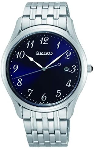 Blue dial enhanced by silver-tone leaf-style hands. Silver-tone stainless steel case with a silver-tone stainless steel band. Quartz movement. 50 meters / 165 feet water resistance. Fixed bezel. Scratch Resistant Sapphire crystal. Solid caseback. Fold Over with Double Push Button Release clasp. Pull / Push crown. Case size 39 mm x 7.1 mm. Band 21 mm x long. Seiko SUR301 Clasic Watch.