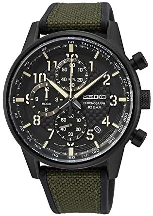 Brand Name Seiko Model number 1 Part Number 1 Item Shape Round Dial window material type hardlex crystal Case diameter 45 millimetres Case Thickness 14 millimetres Band Material Textile Band width 22 millimetres Band Color Green Bezel function Unidirectional Special features chronograph Movement Quartz Display Type Analog