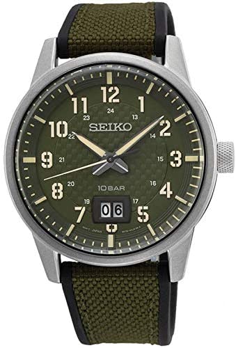 Seiko Neo Sports Quartz Khaki SUR323P1 watch, man 3 needles. This Seiko SUR323P1 Watch, oriented for men, has a steel case, with a circular shape and green color. The strap is made of silicone and green nylon, and the bezel is silver. The glass is curved hardlex, the quartz movement, and the analog display. It belongs to the Neo Sports collection. It can be submerged up to 10 M. Its functions include the following: Calendar. Sporty style. Diameter: 40.8 mm. Caliber: 6N76. The strap that combines nylon and silicone perfectly complements the sporty design of this watch. This elegant piece with the calendar windows at 6 o'clock is powered by a precise quartz movement.