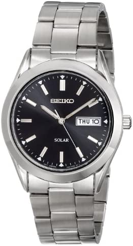 The Seiko solar model SNE039 comes with a radiant black dial with silver hands and hour markers. It has 36mm diameter stainless steel case with a matching stainless steel bracelet (push-button clasp), and a day-date window at 3:00 on the dial. The watch is powered by a Seiko Caliber V158 solar powered quartz movement that recharges when exposed to light. It has a 10 month power reserve when fully charged (no need for battery changes). This watch is water resistant to 30 meters.Features Movement: Solar Caliber V158 Quartz (solar powered) Case: Stainless steel, 36mm diameter Back: Steel back Crystal: Hardlex Band: Stainless steel bracelet, deployant clasp. Water Resistant: 30 meters Warranty: 2 Years