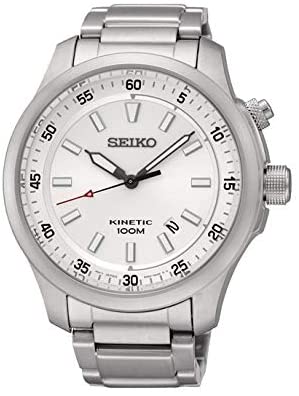 Seiko mens watch. Silver stainless steel case White dial. Automatic movement. Double Locking Fold-over Clasp closure. Water resistance of 100 meters.