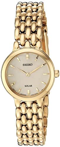 Yellow gold-tone stainless steel case and bracelet. Fixed gold-tone bezel. Gold-tone dial with yellow gold-tone hands and index hour markers. Dial Type: Analog. Seiko caliber V115 quartz movement. Scratch resistant Hardlex crystal. Pull / push crown. Solid case back. Round case shape. Case size: 23 mm. Case thickness: 7 mm. Band width: 12 mm. Deployment clasp. Water resistant at 30 meters / 100 feet. Functions: hour, minute, solar-powered. Casual watch style. Watch label: Japan Movt. Seiko Solar Gold Dial Ladies Watch SUP352P1.