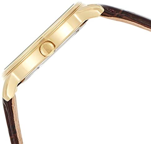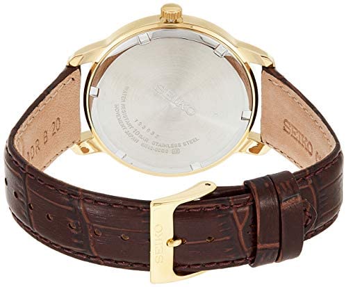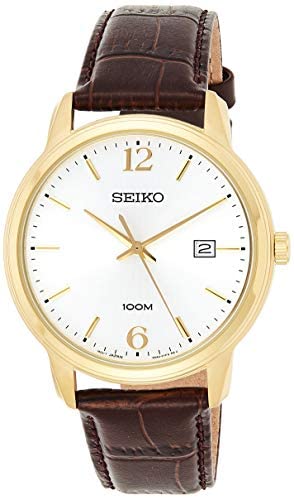 Product DescriptionYellow gold-tone stainless steel case with a brown (calfskin) leather strap. Fixed yellow gold-tone bezel. Silver dial with yellow gold-tone hands and index hour markers. Arabic numerals mark the 6 and 12 o'clock positions. Minute markers around the outer rim. Dial Type: analog. Date display at the 3 o'clock position. Seiko Caliber 6N42 quartz movement. Scratch resistant hardlex crystal. Pull/ push crown. Solid case back. Round case shape. Case size: 41 mm. Case thickness: 9 mm. Band width: 20 mm. Tang clasp. Water resistant at 100 meters/ 330 feet. Functions: date, hour, minute, second. Casual watch style. Watch label: japan movt. Seiko Neo classic silver dial mens watch SUR266P1.Box ContainsWatch, Presentation box, Watch Cushion, Guarantee, Manuals and water resistant usage guide