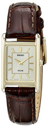 Specifications of Ladies Womens Gold Tone Seiko Solar Watch on Brown Leather Strap. SUP252P1