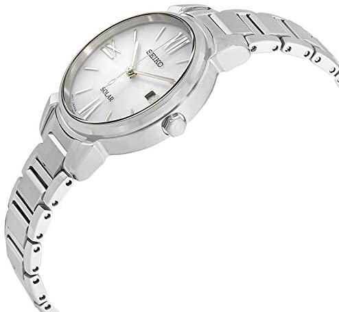 Product DescriptionStainless steel case with a stainless steel bracelet. Fixed stainless steel bezel. Silver dial with silver-tone hands and index hour markers. Roman numerals mark the 3, 6, 9 and 12 o'clock position. Dial Type: Analog. Date display at the 3 o'clock position. Seiko caliber V137 quartz movement. Scratch resistant Hardlex crystal. Pull / push crown. Solid case back. Round case shape. Case size: 30.7 mm. Case thickness: 8.1 mm. Band width: 13 mm. Fold over clasp with a safety release. Water resistant at 50 meters / 165 feet. Functions: date, hour, minute, second, solar-powered. Casual watch style. Watch label: Japan Movt. Seiko Solar Silver Dial Stainless Steel Ladies Watch SUT323.Box ContainsWatch, Presentation box, Watch Cushion, Guarantee, Manuals and water resistant usage guide