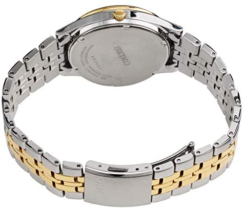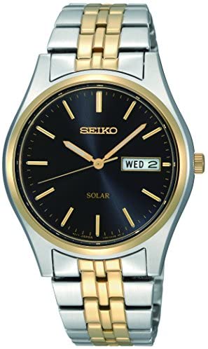 Product DescriptionSeiko Men's two tone bracelet watch with a black dial and stainless steel case, featuring a day&date window. 30M WRBox ContainsWatch, Instruction book / Guarantee slip, Watch cushion