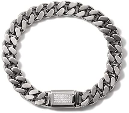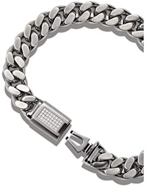Sleek, contemporary stainless steel chain link bracelet distinguished by a custom-designed clasp accented with 32 1.0mm (0.15 CTW) diamonds and the tongue in the shape of the signature Bulova tuning fork.