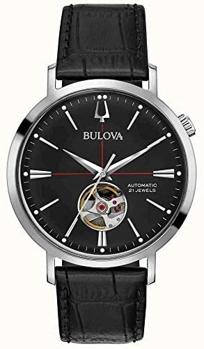 Bulova Men's Time Only Watch from the Aerojet Automatic Collection. Model with 41 mm diameter steel case and dial with notched markers. This watch has black leather strap and buckle closure, the movement is automatic 40 hours power reserve and the water resistance is 3 Atm. Strap Length 20 Cm. The reference is 96A201