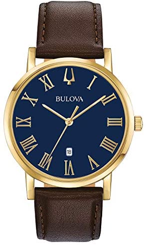 From the Classic Collection. New American Clipper slim-profile style in gold-tone stainless steel case, dark blue dial with Roman markers and date feature, flat mineral glass, smooth grain dark brown leather strap with three-piece buckle closure, and water resistance to 30 meters. Diameter: 40mm Thickness: 6. 9mm