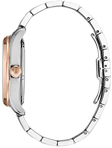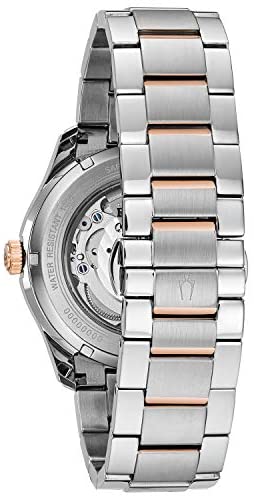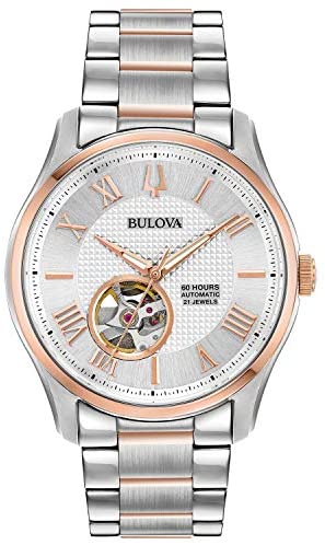 Bulova Wilton 60 hour power reserve automatic stainless steel and rose gold-tone screw-back case, textured silver White three-hand dial with rose gold-tone roman numerals/markers and round dial aperture offering a glimpse of the self-winding 21-jewel heartbeat movement with 60 hours of Reserve power, domed Sapphire crystal with blue anti-reflective coating, stainless steel and rose gold-tone bracelet with push-button deploy ant clasp, and water resistance to 100 meters. Diameter: 42mm Thickness: 12. 7mm