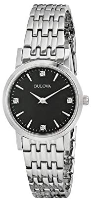 96P148 Bulova women's watch quartz movement (battery) analogue display function just time waterproof 03 ATM water resistant case steel case colour steel casing black Matieare from strap steel strap colour steel 96P148 watch Bulova Donna movement quartz analogue display functions JUST TIME WATERPROOF 03 ATM WATERPROOF WATER RESISTANT Case Material Steel Case colour: Steel Dial colour: Black Dial colour: Black Dial material: Steel Strap material: Steel strap colour: Steel strap colour: Black Steel Case Width (mm) 27. Case Depth (mm) 6; Weight (g) 53.0 Genere Donna