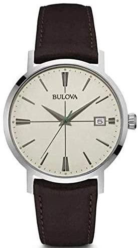 From the Classic Automatic Collection. From the Classic Collection. Stainless steel case with cream dial, silver hour and minute hands while the second hand in iconic Bulova green, double-curved mineral glass, time-only and calendar function, brown leather strap with pin buckle. More Details: Movement: Quartz Case Diameter: 39mm Case Thickness: 7.6 mm Waterproof: 30M 3 Year Limited Warranty
