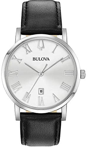 Bulova Men's Time Only Watch from the Clipper Collection. Watch with steel case with a diameter of 40 mm and dial with Roman numerals as indexes. Black leather strap and pin clasp. Quartz Movement And Water Resistance Of 3 Atm. The reference is 96B312