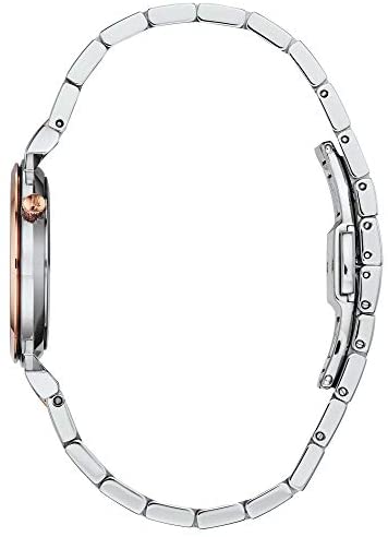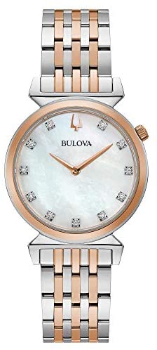 This ladies' Regatta watch from Bulova has a classic and timeless design that is perfect for everyday wear. Inspired by Bulova Heritage timepieces, this sophisticated watch is powered by a slim quartz movement and boasts a 30mm two-tone rose gold-tone and stainless steel case that houses a shimmering white mother-of-pearl dial with two rose gold-tone hands and eleven diamond hour markers, all protected by a flat sapphire crystal. The crown at the 2 o'clock position and unique angled lugs add an updated twist to the design. Completing the look is a two-tone rose gold-tone and stainless steel bracelet with a deployment buckle clasp closure. Features: 30mm rose gold-tone and stainless steel case, White mother-of-pearl dial with two rose gold-tone hands and 11 diamond hour markers, Quartz movement, 30 meter water resistance, Rose gold-tone and stainless steel bracelet with deployment buckle, Bulova style #: 98P192