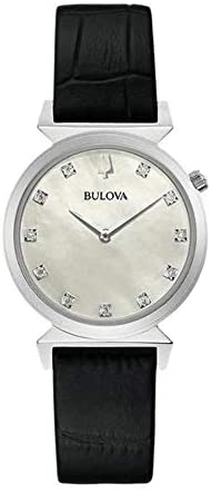 Bulova Women's Time Only Watch from the Classic Regatta Collection. Watch with steel case diameter of 30 mm. Black coconut print leather strap with fold-over clasp. Diamond markers. Watch with sapphire glass, screw back case and 11 diamonds. 3 ATM water resistance. Quartz movement. The reference is 96P210
