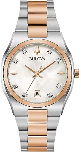 Bulova Women's Time Only Watch from the Surveyor Collection. Watch with 34mm diameter steel case and diamond dial. Rose Steel Strap With Clasp: Deployant. Quartz Movement And Water Resistance Of 3 Atm. Mother of Pearl Dial. The reference is 98P199