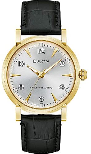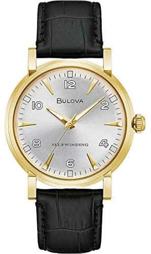Bulova Men's Time Only Watch from the Clipper Collection. Watch with gold steel case with a diameter of 39 mm and dial with indexes and numbers. Black Coconut Print Leather Strap With Clasp: Pin Buckle. Automatic Movement And Water Resistance Of 3 Atm. A Vista Caseback, Domed Mineral Glass The reference is 97A152