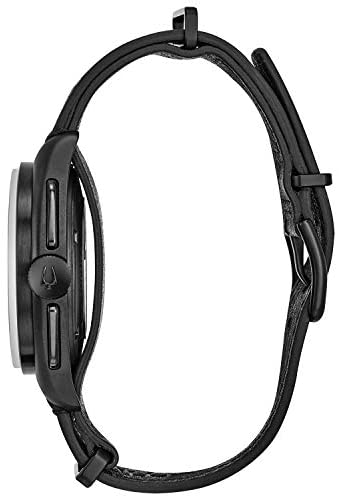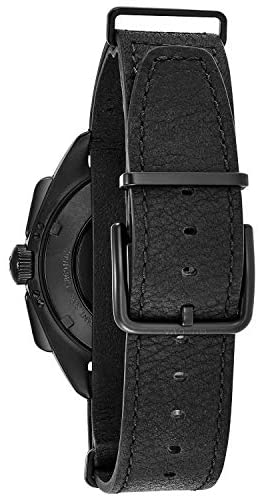 Special Edition Lunar Pilot Chronograph Watch from the Archive Series Six-hand chronograph movement features proprietary high-performance quartz technology with 6 kHz vibrational frequency for precise accuracy. In stainless steel with matte black IP finish, black dial with white accents, anti-reflective curved sapphire crystal, black leather NATO-style strap with three-piece buckle closure, and water resistance to 100 meters. 45mm black ion-plated stainless steel Chronograph Black dial with white accents Tachymeter Anti-reflective curved sapphire glass 50meter water resistance Quartz movement with 6 kHz vibrational frequency Bulova Style#: 98A186