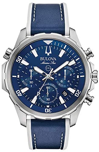Watch Sizing GuideAdd a new depth to your look with the Marine Star Bulova® timepiece.Stainless steel case.Leather strap with adjustable buckle closure. Round face.Three-hand analog display with quartz movement.Blue dial features silver-tone hands and hour markers, three subdials, minute track, date display window, and Bulova detailing.Chronograph functionality.Water resistant up to 330 feet. Imported.Your Bulova watch is covered by Bulova's 3-Year Global Warranty.Measurements: Case Height: 43 1⁄2 mm Case Width: 43 1⁄2 mm Case Depth: 11 4⁄5 mm Band Width: 21 2⁄5 mm Band Circumference/Length: 9 1⁄2 in Weight: 3.6 oz