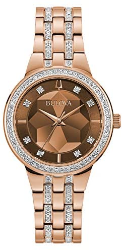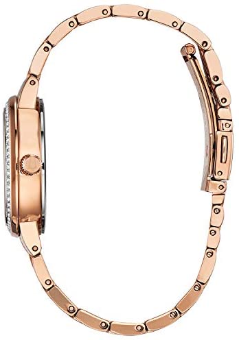 Rose gold-tone stainless steel case with rose gold-tone faceted mineral glass dial to convey a 3-D look. Embellished with 120 Swarovski Crystals on the rose gold-tone stainless steel case and bracelet with a short fold over buckle with pushers, flat mineral crystal, water resistance to 30 meters.
