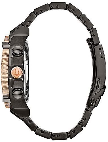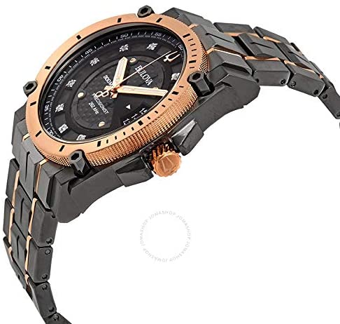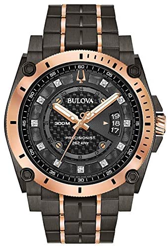 From the Precisionist collection with precise timing to 1/1000th of a second and continuous-sweep second hand.New Champlain style in Grey IP stainless steel with rose gold-tone accents on case and bracelet, 11 diamonds individually hand set on two-tone black/grey dial with calendar feature, curved mineral glass, screw-back case, fold-over buckle closure with safety lock and extender, and water resistance to 300 meters.