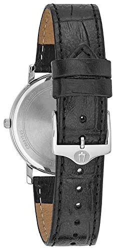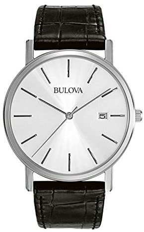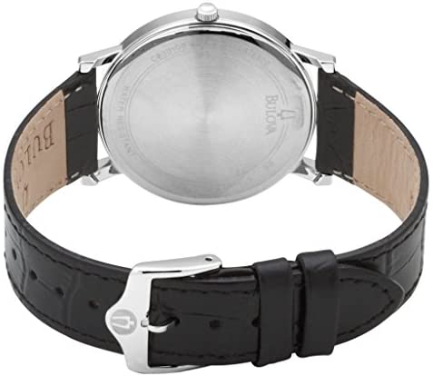 Product DescriptionBulova Men's Classic Dress Quartz Watch with Silver Dial Analogue Display and Black Leather Strap 96B104.Brand StoryBulova, an American brand, is known for its innovation, craftsmanship and advanced technology. Since 1875, when founder Joseph Bulova opened his store on Maiden Lane in downtown Manhattan, Bulova has remained true to his legacy—mastering the classic art of timekeeping while always embracing the future. A Bulova watch is not only a timepiece; it is a piece of history.Manufacturer's DescriptionBulova is a recognised leader in diamond and high-performance sport timekeeping, with a wide range of watches including the ultra-accurate Precisionist and an extensive selection of styles for dress, sport and casual wear. Always crafted of the finest materials, including hypoallergenic 316L solid stainless steel, diamonds, mother-of-pearl, carbon fibre, top quality leather and Duramic (Bulova’s exclusive ceramic/nylon composite). A Bulova watch is not only a timepiece; it is a piece of history.Box ContainsWatch, Presentation box, Watch Cushion, Guarantee