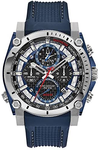 Precisionist Champlain Chronograph Powered by Bulova’s proprietary Precisionist eight-hand quartz chronograph movement with a 262kHz vibrational frequency—eight times greater than standard timepieces—for unparalleled accuracy. Stainless steel and blue IP steel screw-back case with screw-down crown, black carbon fiber chronograph dial with date feature and red accents, curved mineral crystal, textured blue polyurethane strap with three-piece buckle closure, and 300-meter water resistance. Diameter: 46mm Thickness: 17. 5mm
