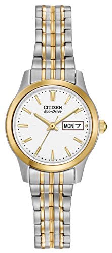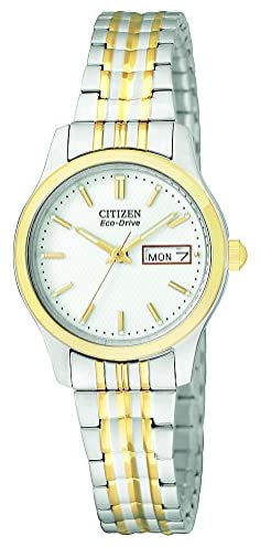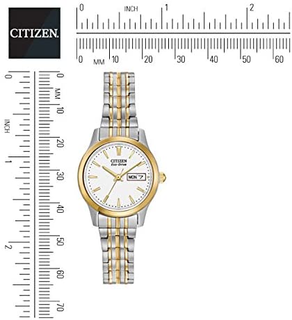 Product descriptionThis two-tone ladies' watch from Citizen is a true classic. It remains simple and sleek with a great interlocking bracelet. Must be seen.Box ContainsWatch Presentation box Watch CushionGuarantee