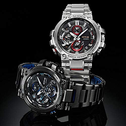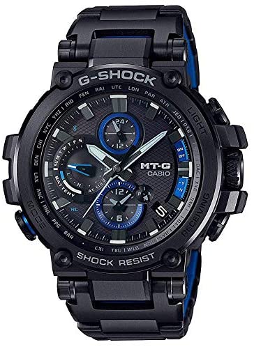 The G-SHOCK MT-G combines metal and resin into forms of essential functional elegance, and also provides TRIPLE G RESIST durability. Connected Engine supports time correction using a time calibration signal and Bluetooth connection. MULTIBAND 6 automatically adjusts time settings based on reception of one of six time calibration signals around the globe for automatic time adjustment when you are within the range of a signal, even if the connection with a smartphone is not possible for some reason. Neobrite Spherical, Sapphire Glass with non-reflective coating Screw Lock Crown Black IP TRIPLE G RESIST (Shock resistant, Centrifugal force resistant, Vibration resistant) Black ion plated case Black ion plated band 200-meter water resistance LED light (Super Illuminator) Afterglow Solar powered Time Calibration Signals Mobile link (Wireless linking using Bluetooth) The auto hand home position correction World time: 39 time zones 1-second stopwatch Countdown timer Daily alarm Battery level indicator Power Saving (hands stop to save power when the watch is left in the dark) Full auto-calendar (to year 2099) Accuracy: ±15 seconds per month (with no signal calibration and mobile link function) Approx. battery operating time: 5 months on rechargeable battery (operation period with normal use without exposure to light after charge) - 18 months on rechargeable battery (operation period when stored in total darkness with the power save function on after full charge) Size of case : 55.8×51.7×14.4mm Total weight : 182g
