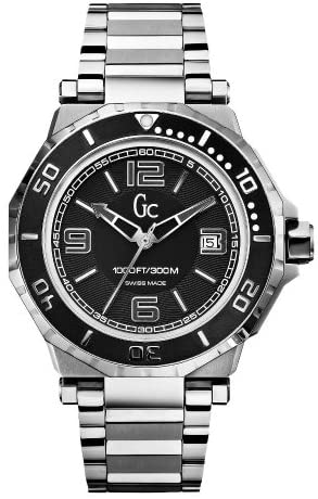 A deep sea treasure from Gc Swiss Made Timepieces. The GC-3 Diver watch is crafted of stainless steel bracelet and roundcase with black bezel featuring silver tone numerals. Black sun-ray patterned dial with stamped Arabic numerals. Date. Automatic movement. Water resistant to 300 meters.