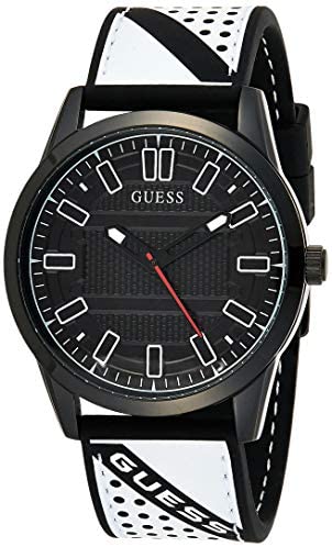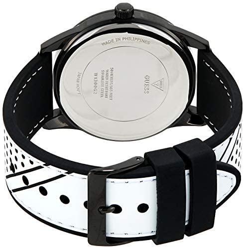 Guess Streak Men's Watch W1300G2 Stainless steel case, black coating, polished. Silicone strap, black/white, pin buckle. Quartz movement, battery operated. 50 m water resistant. Dial colour: black. Case width: approx. 42 mm. Case height: approx. 8 mm. Comes with box and information card. For environmental protection reasons, user manuals and other information are only available on the manufacturer's website.