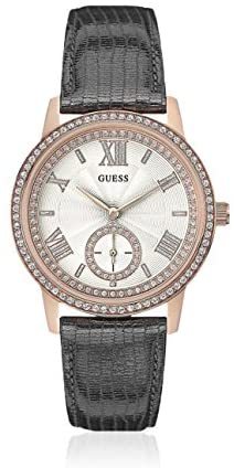 Brand Name GUESS Model number W0642L3 Part Number W0642L3 Model Year 2017 Item Shape Round Case material Stainless Steel Band Material Leather Band length women's standard Band width 22 millimetres Band Color Black Dial color White Special features Seconds Sub Dial, Stone Set Item weight 46 Grams Movement Quartz Water resistant depth 3 bar