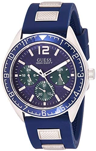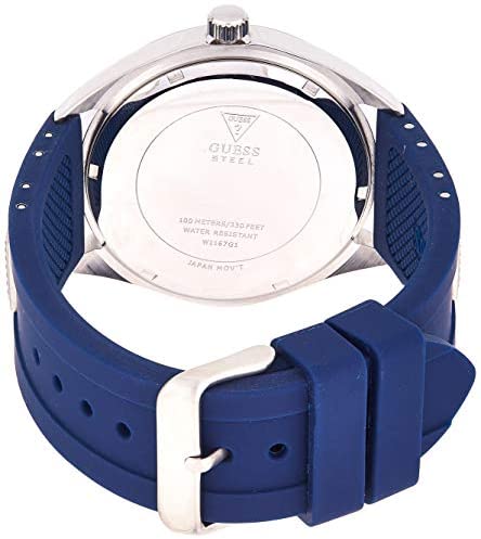 Brand Name GUESS Model number W1167G1 Part Number W1167G1 Model Year 2018 Item Shape Round Band Material Silicone Band width 24 millimetres Band Color Blue Dial color Blue Special features Calendar Item weight 99 Grams Movement Quartz