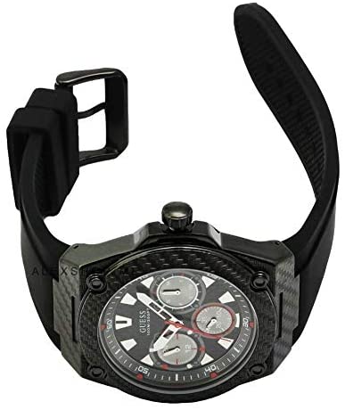 Black stainless steel case with a Black rubber strap. Fixed Black stainless steel bezel. Black dial with silver-tone hands and index hour markers. Minute markers around the outer rim. Dial Type: analog. Luminescent hands and markers. Three sub-dials displaying: day of the week, date and 24 hour. Quartz movement. Scratch resistant mineral crystal. Screw down crown. Solid case back. Round case shape, case size: 45 mm, case thickness: 11 mm. Band width: 22 mm. Tang clasp. Water resistant at 100 meters/ 330 feet. Functions: date, day, hour, minute, second. Sport watch style. Guess legacy Black dial mens watch W1048G2.