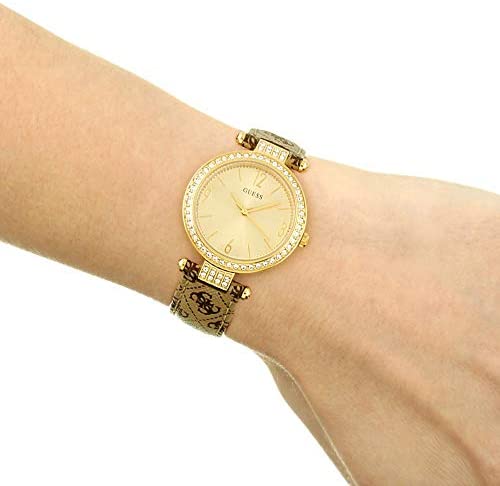 Brand Name GUESS Model number W1230L2 Part Number W1230L2 Item Shape Round Case material Stainless Steel Band Material Leather Band length Womens Standard Band width 16 millimetres Band Color Brown Dial color Gold Bezel material Stainless Steel Item weight 34 Grams Movement Quartz