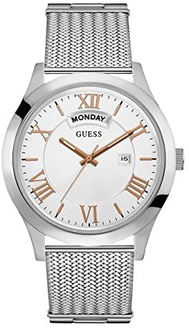 Product DescriptionGuess gents watch W0923G1. This gents dress watch features a silver tone stainless steel mesh strap with a Pilot buckle closure, a silver tone stainless steel case, and a white dial face with rose gold features.Box ContainsThe box contains the Guess watch and a warranty card.