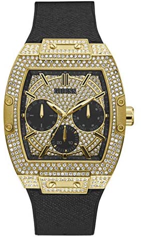 A black silicone strap and grand gold-tone case host endless crystal accents for this high-style multifunction timepiece by GUESS