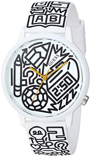 Brand Name GUESS Model number V0023M9 Part Number V0023M9 Item Shape Round Case material Stainless Steel Band Material Silicone Band length 8.5 inches Band width 17.6 millimetres Band Color White Dial color white Bezel material Stainless Steel Item weight 34 Grams Movement Quartz
