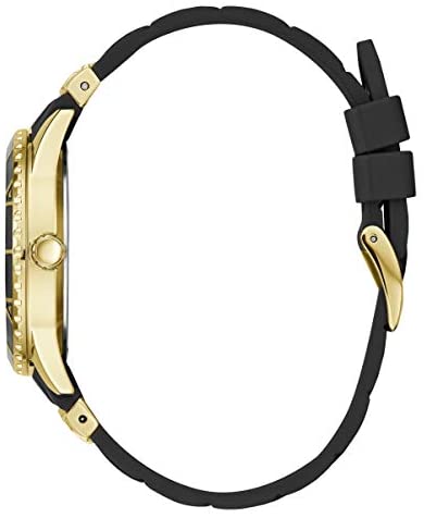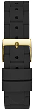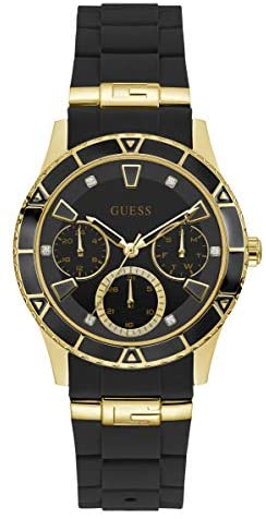 Boasting a sport luxe style, this bold Valencia timepiece from Guess is ideal for everyday wear. Crafted with a stainless steel gold plated dial case, the piece features a black enamel bezel. A black multi-functional dial is set with contrasting gold accents and crystal indexes. The multi-functional display that is composed of three sub-dials showcasing a date, day and 24 hour time. The piece is finished with a durable black silicone strap.