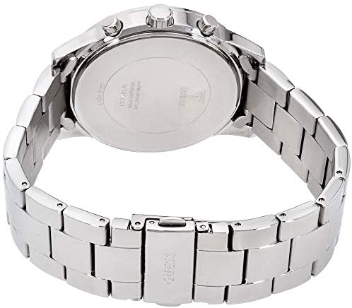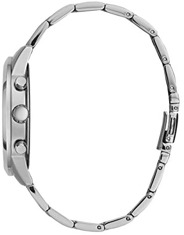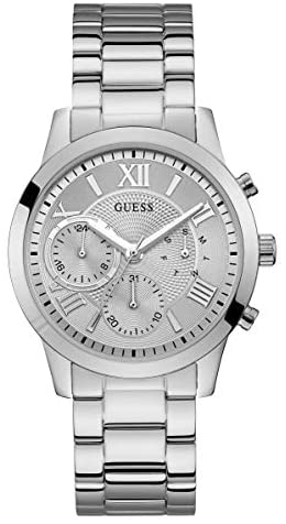 Specifications of Guess Women's multi-dial solar watch with stainless steel strap.
