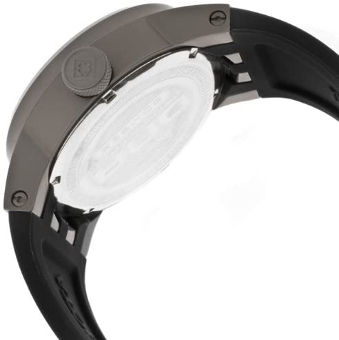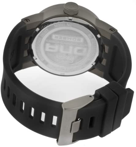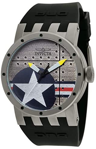 Titanium case with a black silicone rubber divers strap. Fixed titanium bezel. Silver-tone dial with yeallow hands. Dial Type: Analog. Luminescent hands and markers. Quartz movement. Precision Swiss parts ronda 513 quartz engine. Scratch resistant flame fusion crystal. Pull / push crown. Solid case back. Case diameter: 46 mm. Case thickness: 15mm. Round case shape. Band width: 33.5mm. Band length: 9.5 inches. Tang clasp. Water resistant at 100 meters / 330 feet. Functions: hour, minute, second. Casual watch style. Invicta Dna Bomber Mens Watch 11647.