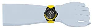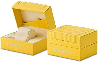 Black dial enhanced by silver-tone hands. Black stainless steel case with a yellow silicone band. Quartz movement. 100 meters / 330 feet water resistance. bezel. Flame Fusion crystal. Buckle clasp. Pull / Push crown. Case size 50 mm x 15 mm. Band 32 mm x 8.25 incheslong. Invicta 33038 Aviator Watch.