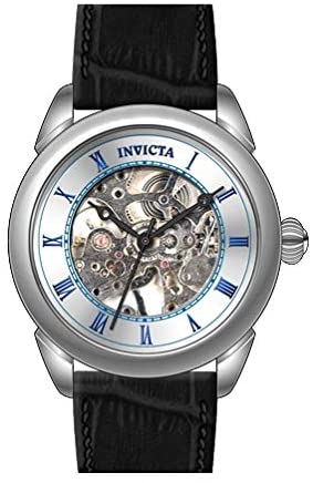 Silver (Skeleton Center) dial enhanced by black breguet-style hands. Silver-tone stainless steel case with a black leather band. Hand Wind movement. 30 meters / 100 feet water resistance. Fixed bezel. Flame Fusion crystal. Transparent caseback. Tang clasp. Pull / Push crown. Case size 42 mm x 13 mm. Band 22 mm x 7.75 incheslong. Invicta 31153 Specialty Watch.