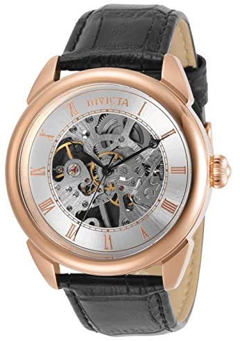Silver (Skeleton Center) dial enhanced by black hands. Rose Gold-tone stainless steel case with a black leather band. Automatic movement. 30 meters / 100 feet water resistance. Fixed bezel. Flame Fusion crystal. Transparent caseback. Tang clasp. Pull / Push crown. Case size 42 mm x 13 mm. Band 22 mm x 7.75 incheslong. Invicta 31155 Specialty Watch.