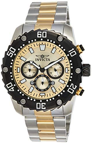 Product DescriptionThis Invicta men's watch is part of the pro diver collection. This Invicta 22519 has a 48 millimeters stainless steel case with a gold dial. This model is powered by an accurate quartz movement. The Invicta pro diver watch has a 24 millimeters stainless steel band.This Invicta watch is protected by flame fusion glass. The stainless steel watch is 10 bars water resistant and includes a yellow Invicta box and an instruction manual.Box ContainsWatch, Presentation box, Watch Cushion, Guarantee