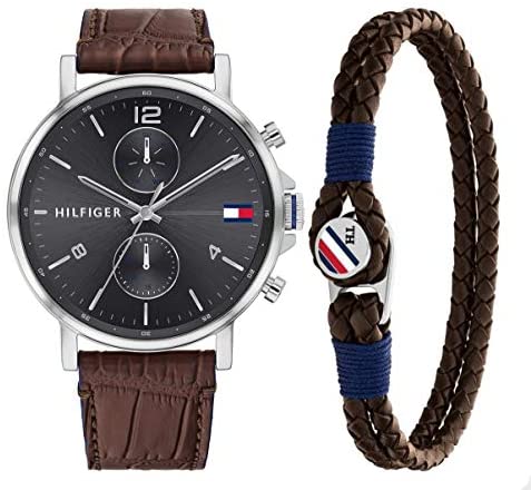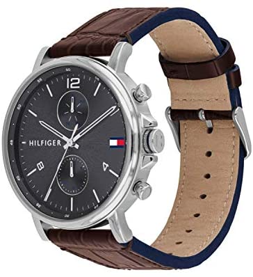 Brand Name Tommy Hilfiger Model number 2770076 Part Number 2770076 Item Shape Round Case material Stainless Steel Band Material Leather Band width 22 millimetres Band Color Brown Dial color Grey Bezel material Stainless Steel Special features Calendar Item weight 62 Grams Movement Quartz