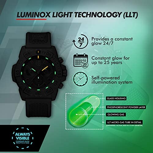 Download and print new PDF Size-Guide to ensure the watch fits your wrist. Please, precisely follow all the instructions mentioned in the PDF for a seamless and accurate printing. -- Officially licensed by the United States Department of the Navy, the Navy SEAL series was developed to their specifications and suggestions. For over 25 years, Luminox has partnered with the world’s toughest maritime commandos to continuously hone and refine a watch tough and useful enough to be considered “first-line gear” for the finest warriors. -- Technical Specifications: 200 meters / 660 feet / 20 ATM water resistant, Hardened mineral glass, Unidirectional rotating Bezel, Chronograph, Date, Protected crown, Stainless steel screw on case back -- Lighting Technology: Orange & green Luminox Light Technology on dial ring and minute and hour hands (LLT) and green Super-LumiNova on second hand (SLN) - LLT: Self-powered illumination system employing tiny micro gas light sources; Always visible under any circumstances; Never press a button to light up; Does not need a battery to illuminate; 24 hours a day, 7 days a week for up to 25 years. SLN: Light-powered illumination system; Provides glow for up to 1 hour. -- Details: Case diameter 45 mm, Case thickness 15 mm, Band length 210 mm, Band width 24 mm, Black CARBONOX case with Black Rubber band and Black dial .